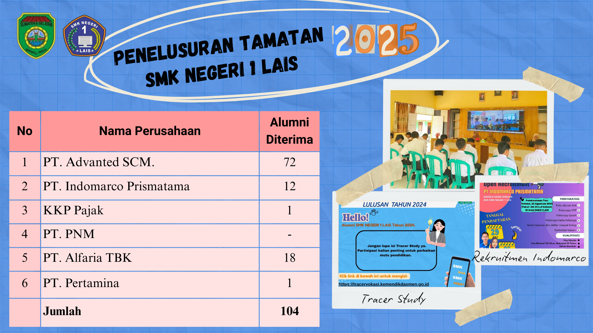 Pada tahun 2025 SMK Negeri 1 Lais banyak melakukan open rekruitmen untuk mengupayakan tamatan atau alumni bisa bekerja dan mandiri